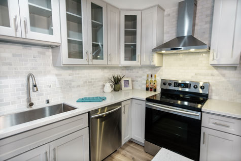 Brand new kitchen with quartz countertops, mosaic subway tile backsplash, stainless steel appliances, island/eating bar, and pendant lights open to oversized dining room with deck access